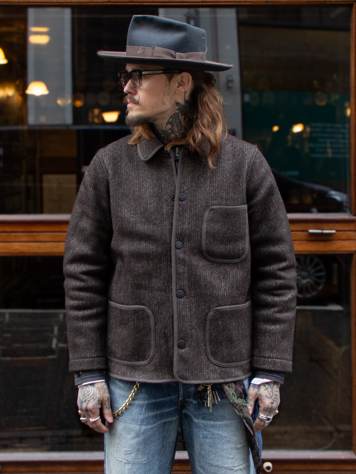 This season’s updated coverall jacket features refined pocket shapes and a softly rounded collar, giving it a cleaner silhouette while maintaining its timeless character. The fabric—originally developed over a century ago for outdoor use—uses a dual-layer construction: a cotton Russell-knit exterior paired with a wool-fleece interior similar to a heavyweight sweatshirt. With over 70% of the fabric made from deeply brushed wool fleece, it offers remarkable warmth and durability uncommon for knit-based materials.