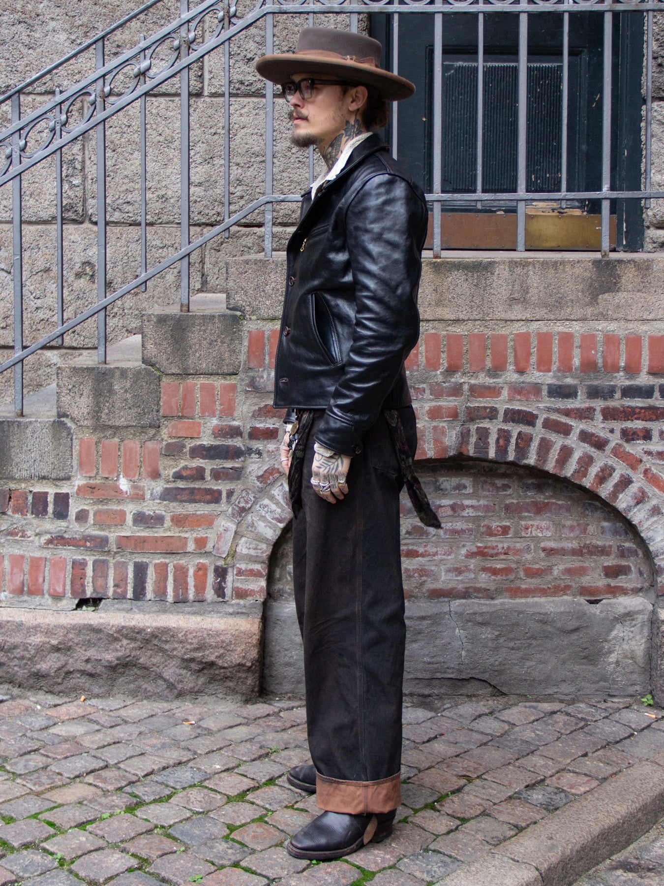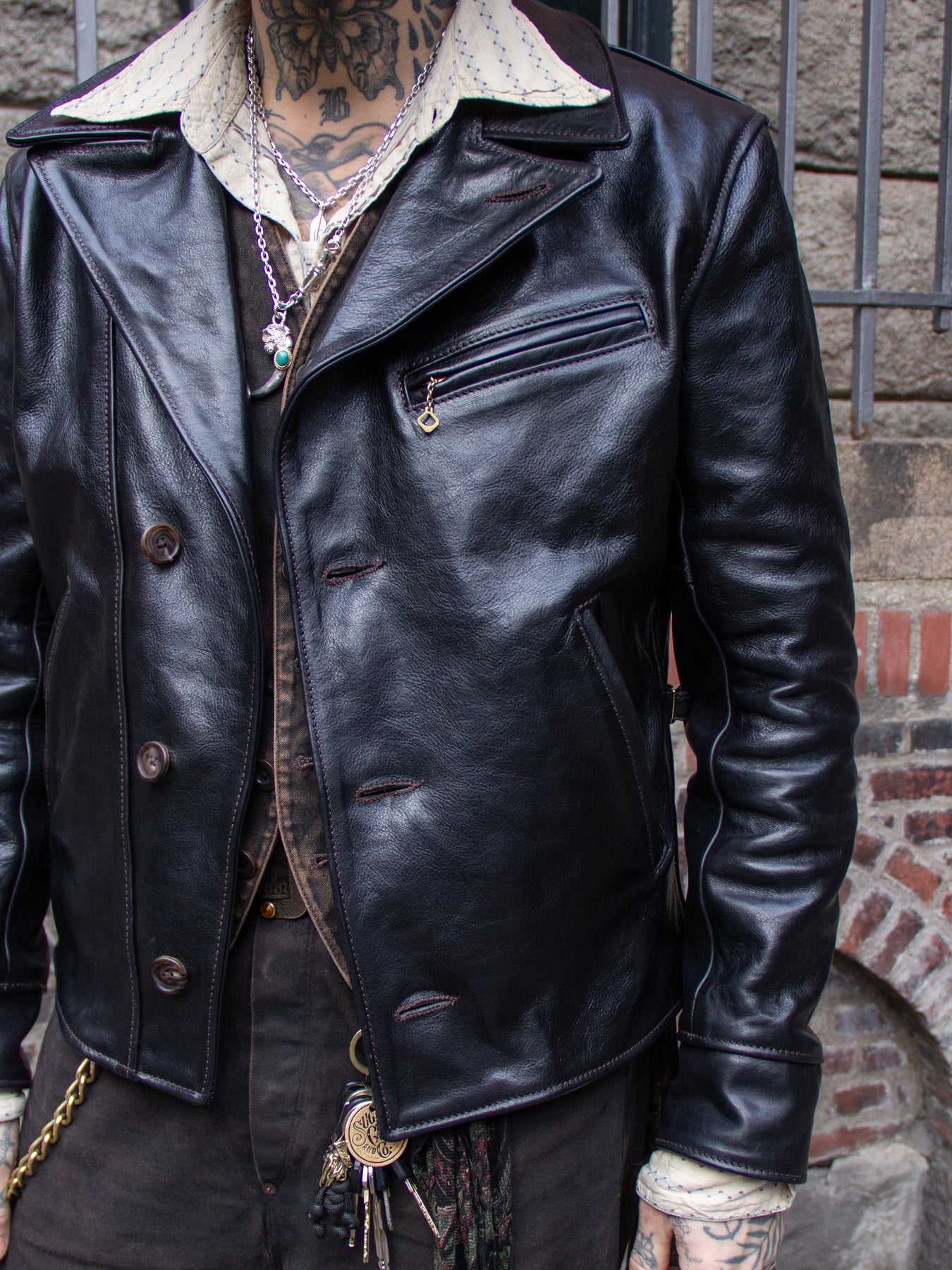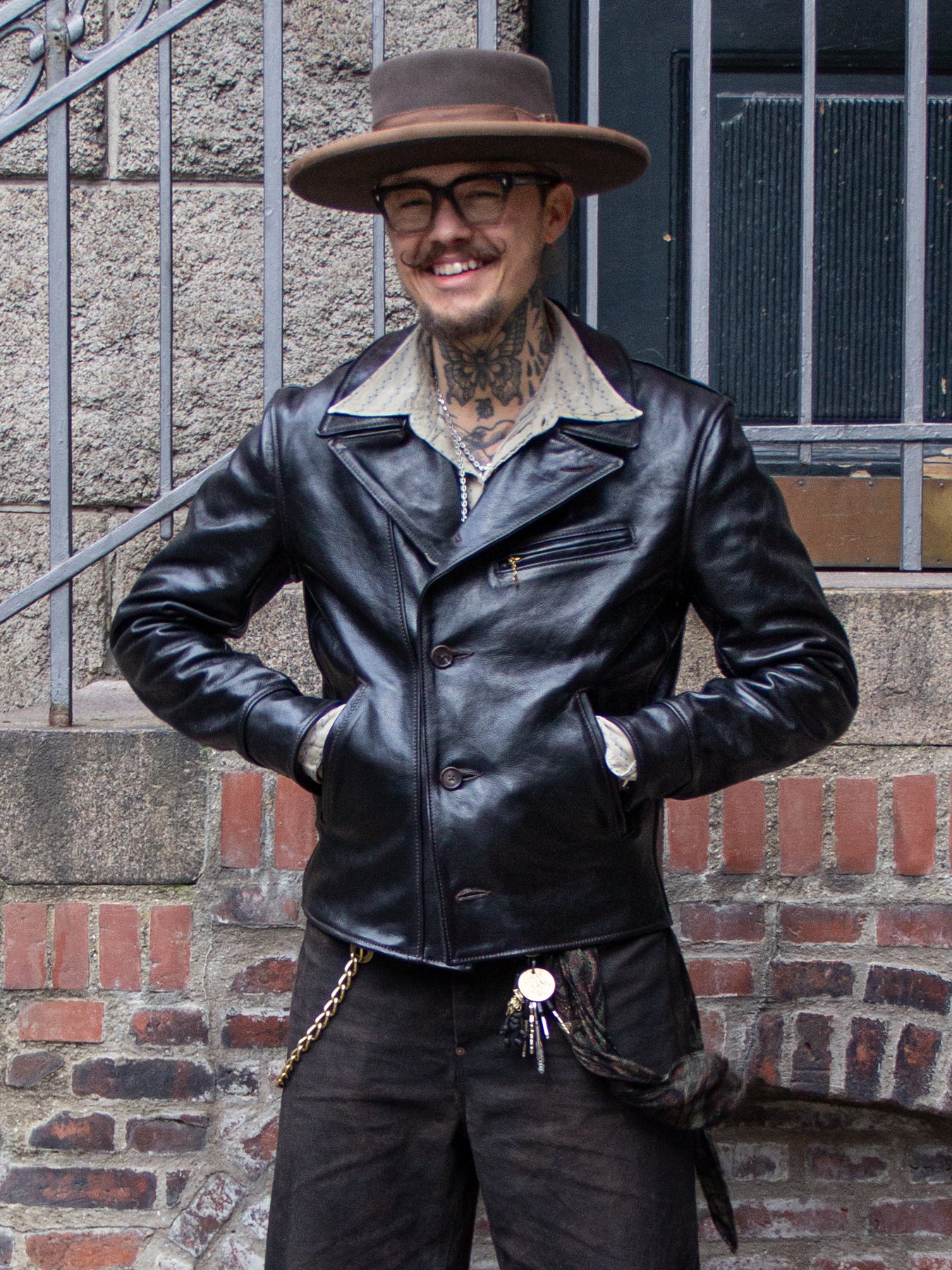 To honor these legends, Aero created the Hooch Hauler jacket. Inspired by early 1930s leather jackets, it features a slim, tailored cut, a unique period-style back, and a raised armhole with narrower sleeves, reflecting the sleek, functional designs of the first zip-up leather jackets.