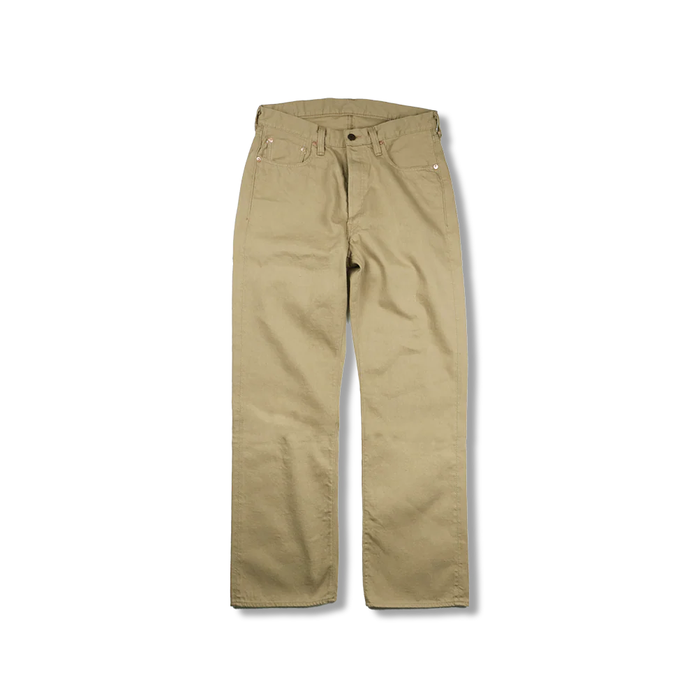 The 0105 model pants are crafted from 12oz denim woven on shuttle looms using the “super smooth denim” method with uneven yarns of different counts (#7 x #10), both warp and weft dyed in beige. Dyeing the weft yarns creates a unique depth of color and imparts a handwoven-like texture distinct from ordinary denim.