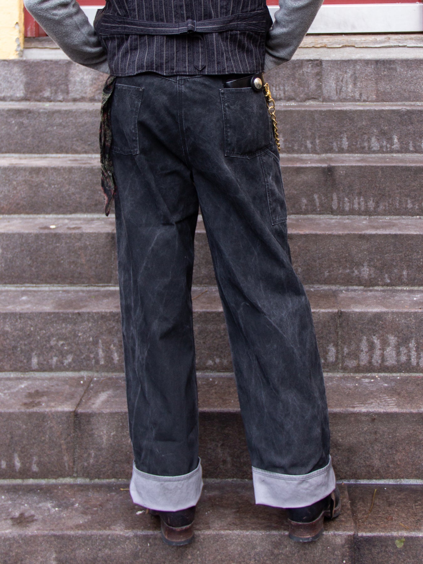 Authentic functional details include tool pockets, suspender buttons, and a buckle-back cinch, all reinforcing the garment’s rugged workwear heritage.