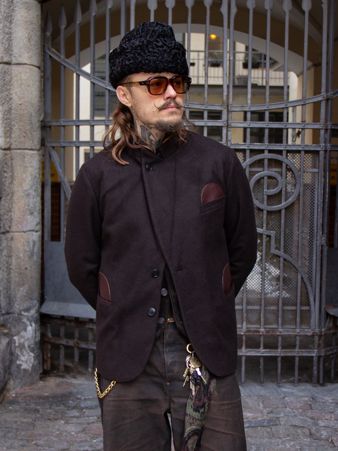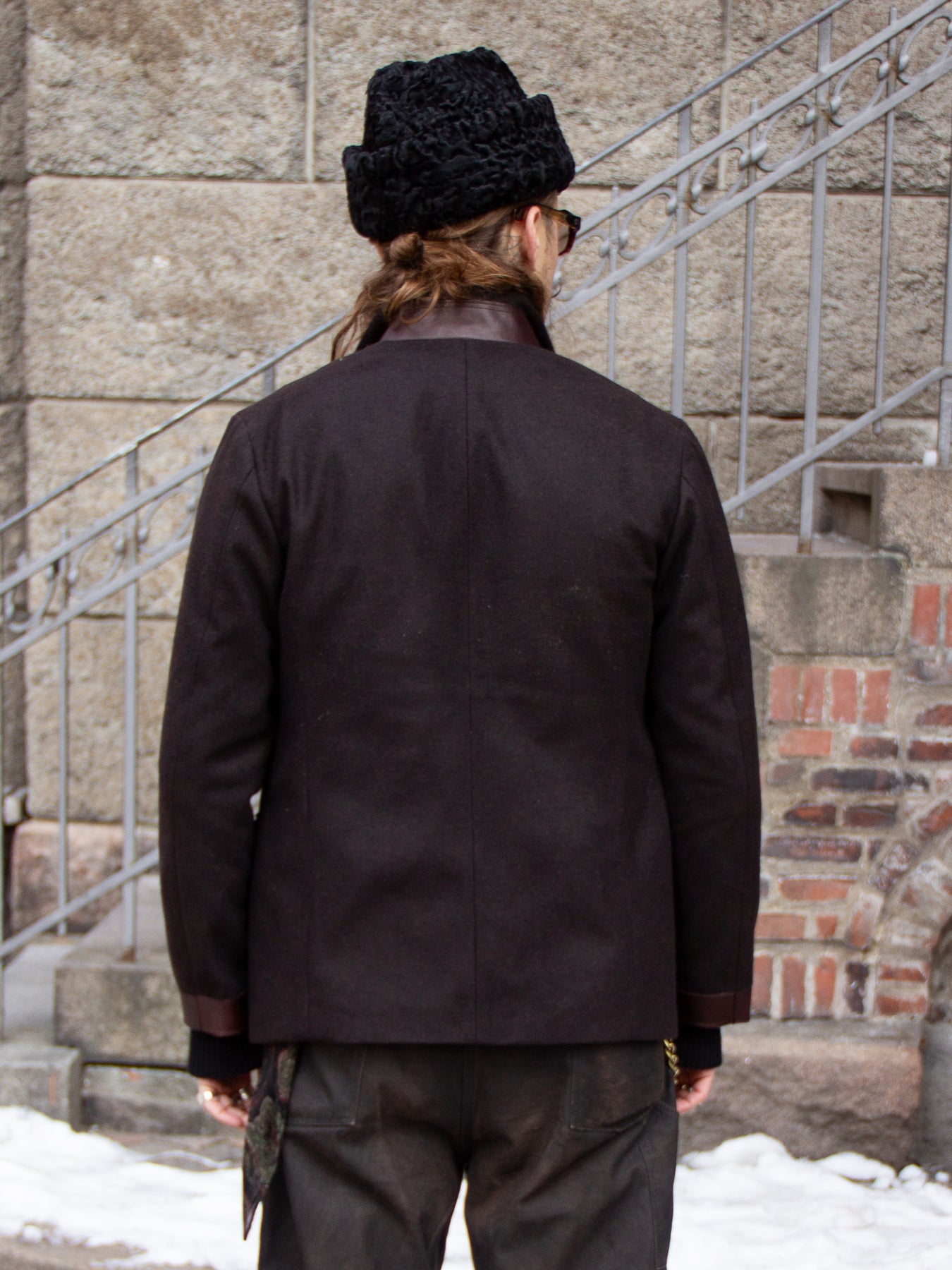 Crafted from premium Melton wool, the jacket features standout details including brown horsehide leather reinforcement trim, a wide lapel design, classic horn buttons, and practical inner pockets for added storage