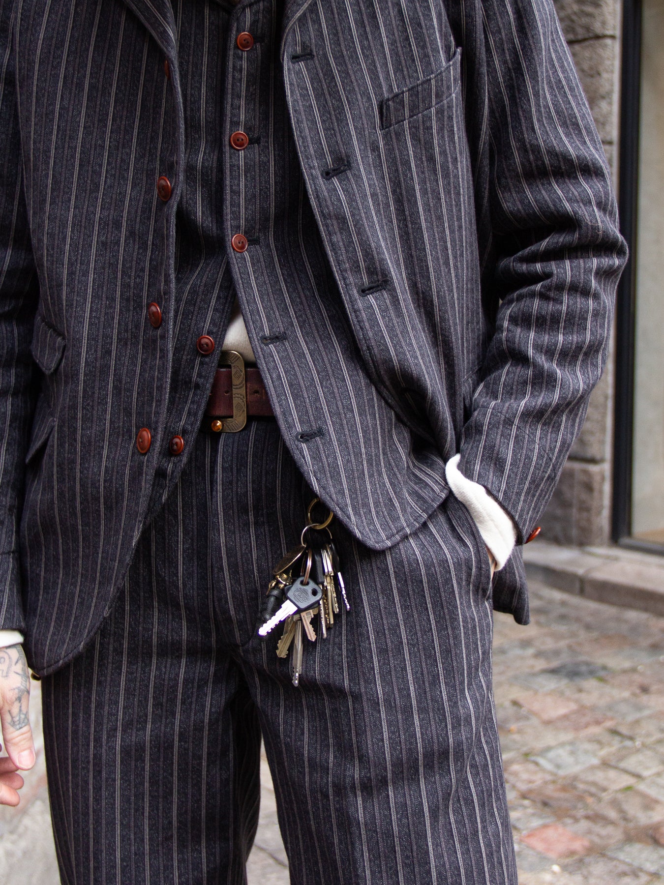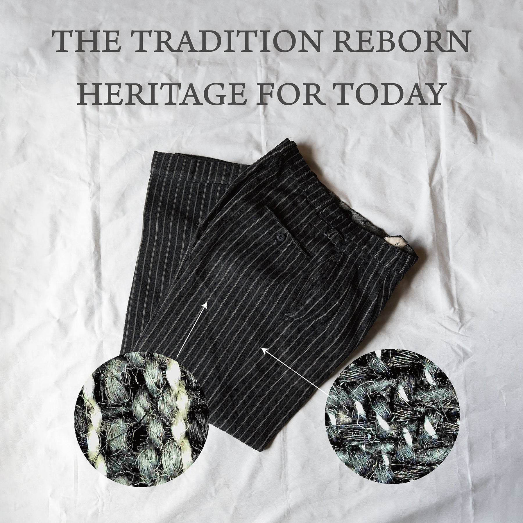 The original 1930s French trousers were more than a vintage reference — they became a study in how fabric itself was once made. By dismantling and analyzing the original garment thread by thread, Prequel uncovered the precise weaving techniques behind its deep color and striking striped contrast, achieved through careful control of yarn tension and density.