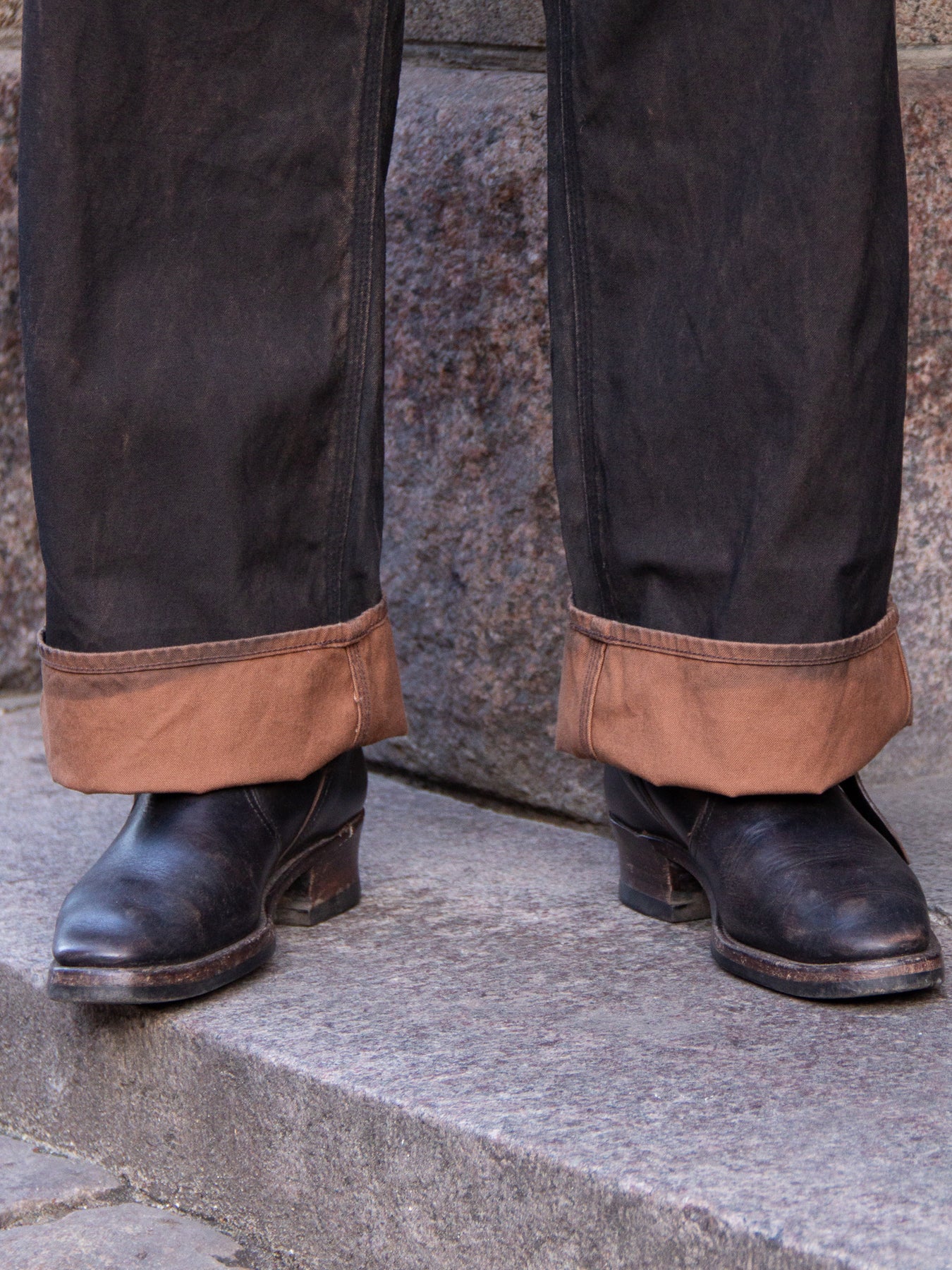 Inspired by early workwear, the fit is straight, wide, and high-waisted, staying true to classic vintage proportions. Functional details such as tool pockets, suspender buttons, and a buckle-back cinch reinforce the garment’s rugged workwear heritage.