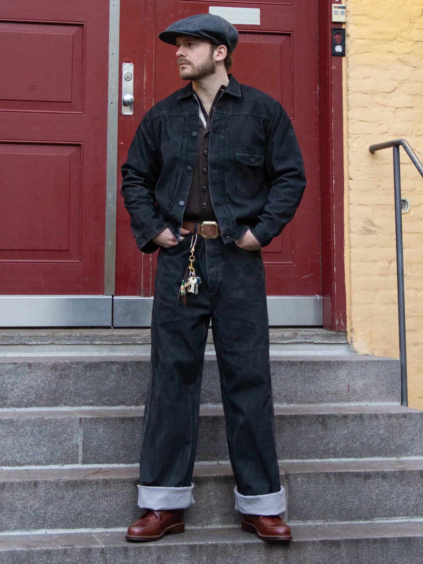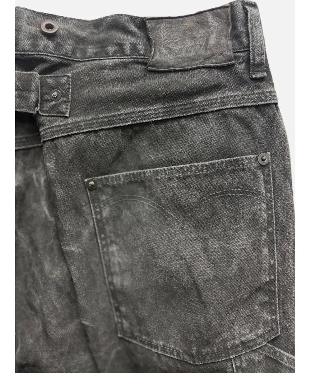 Authentic functional details include tool pockets, suspender buttons, and a buckle-back cinch, all reinforcing the garment’s rugged workwear heritage.