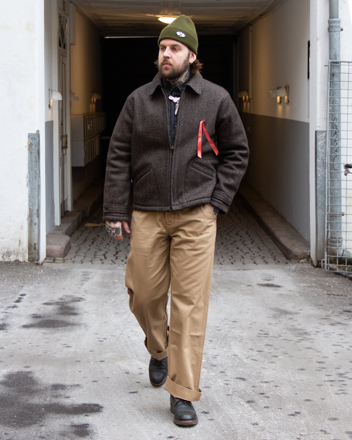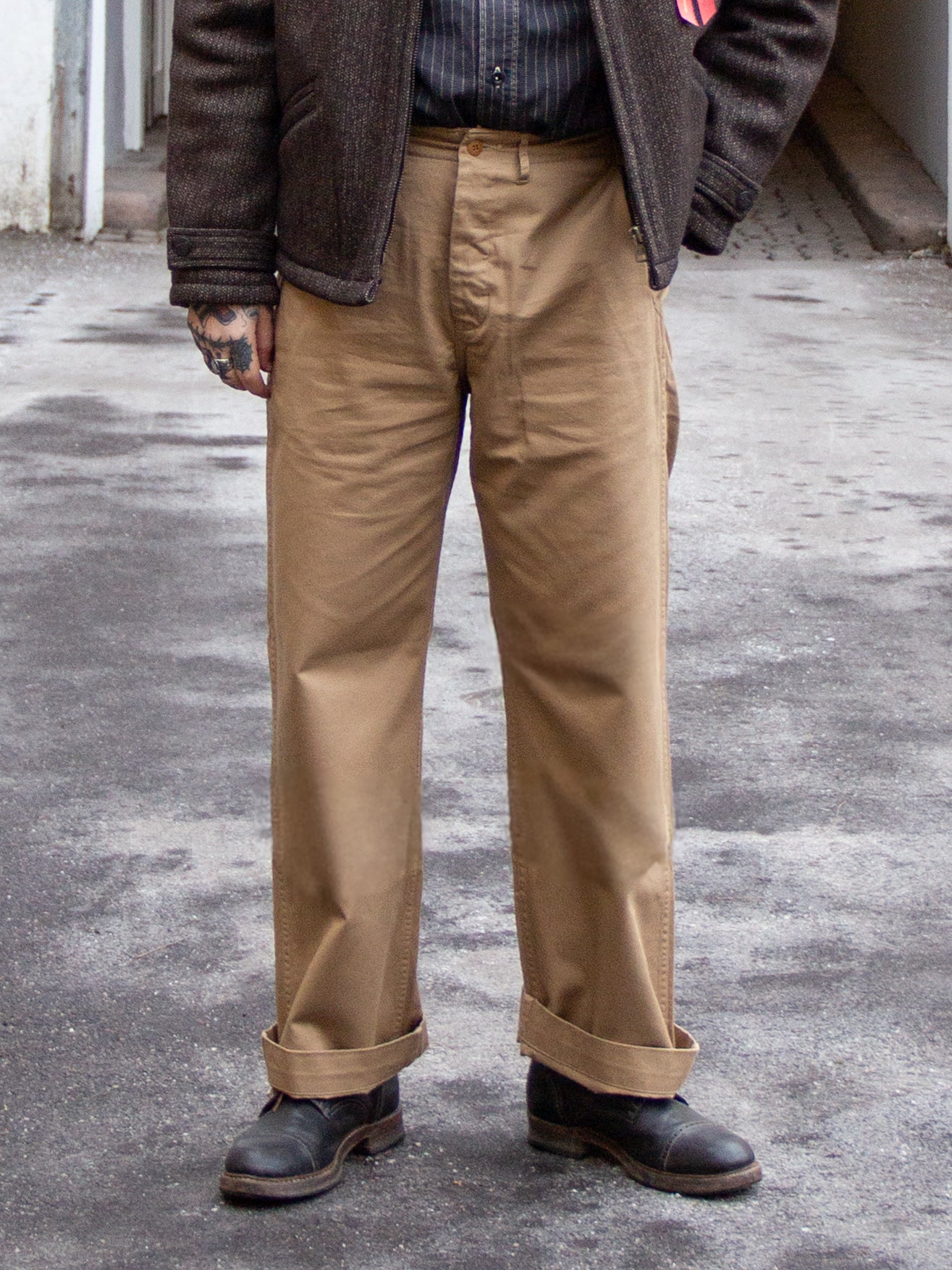 These classic chino trousers are inspired by the 41 Khaki colorway adopted by the U.S. Army in the early 1940s. They feature double-stitched rolled seams, slash pockets on the sides, and a wide silhouette. The back pockets are 2mm wide and feature double welts for a stylish look. The chinos are made with high-quality combed yarn, which has been thoroughly purified of short fibers for a superior luster. Like jeans, the more you wear them, the more the texture of the fabric will improve, taking on the feel of vintage 41 Khaki.