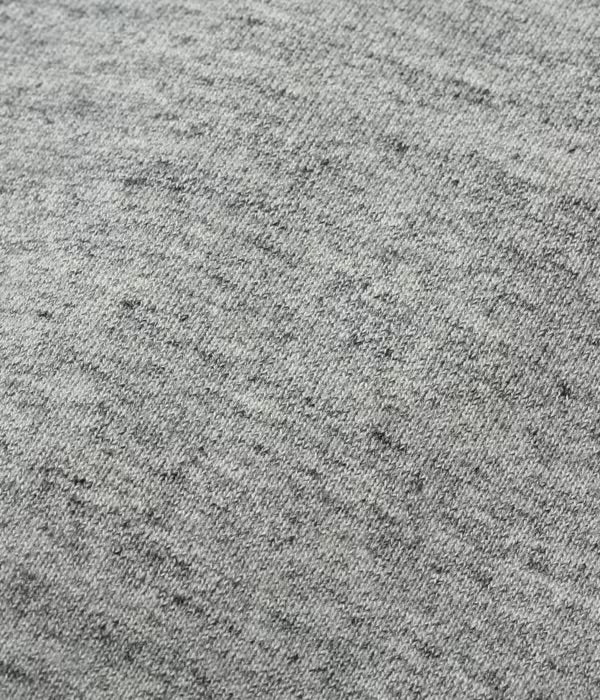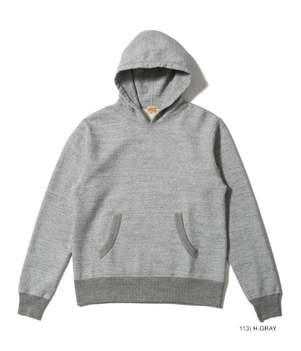 A sweatshirt parka made from a heavy fabric knit with 20/20/7 yarn counts for the face, middle, and lining threads, and constructed using a flat-seamer machine. The hood is made by bonding two layers of fabric together, and the kangaroo pocket features distinctive piped ribbing.