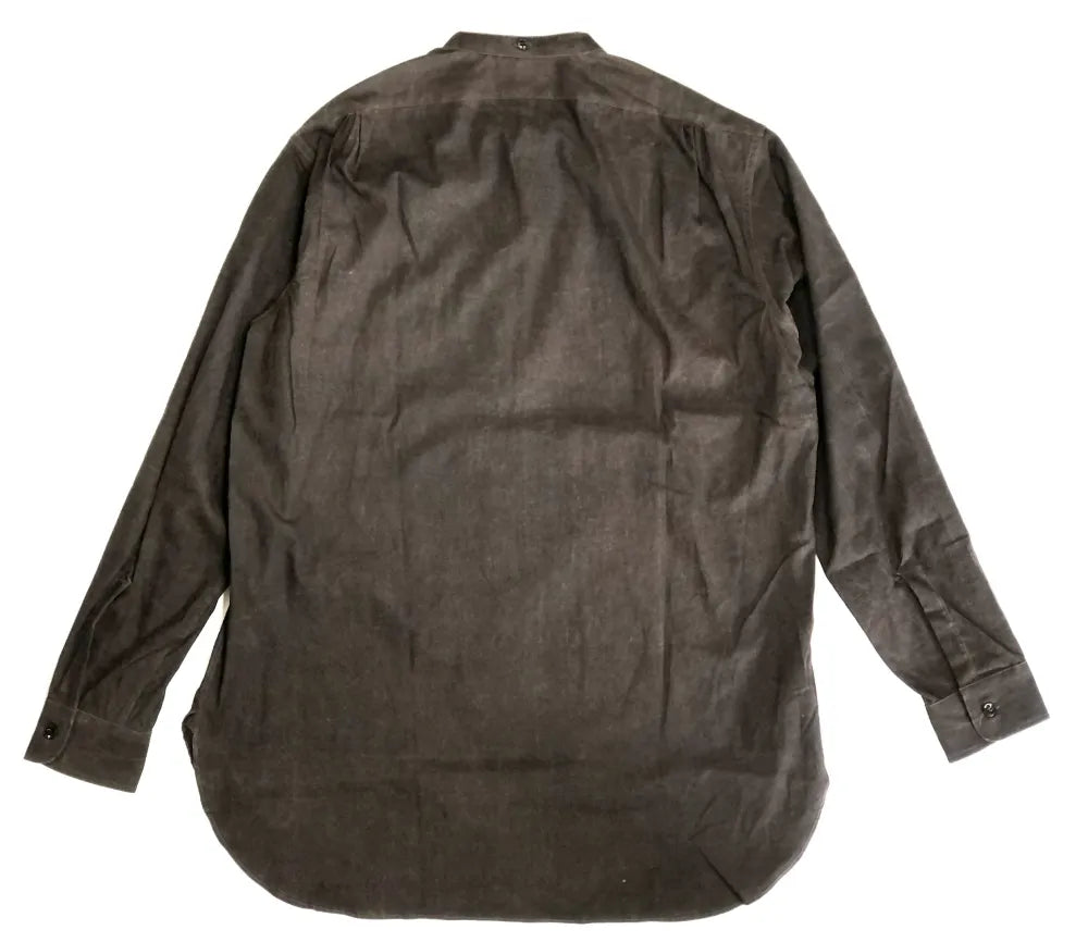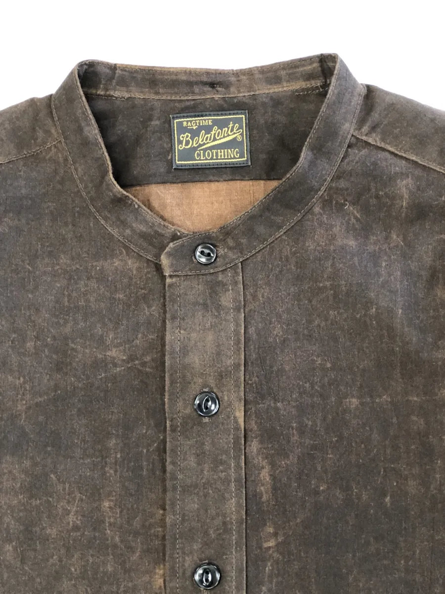 Vintage inspired collar less shirt crafted from premium Japanese mud dyed/ doromole fabric.