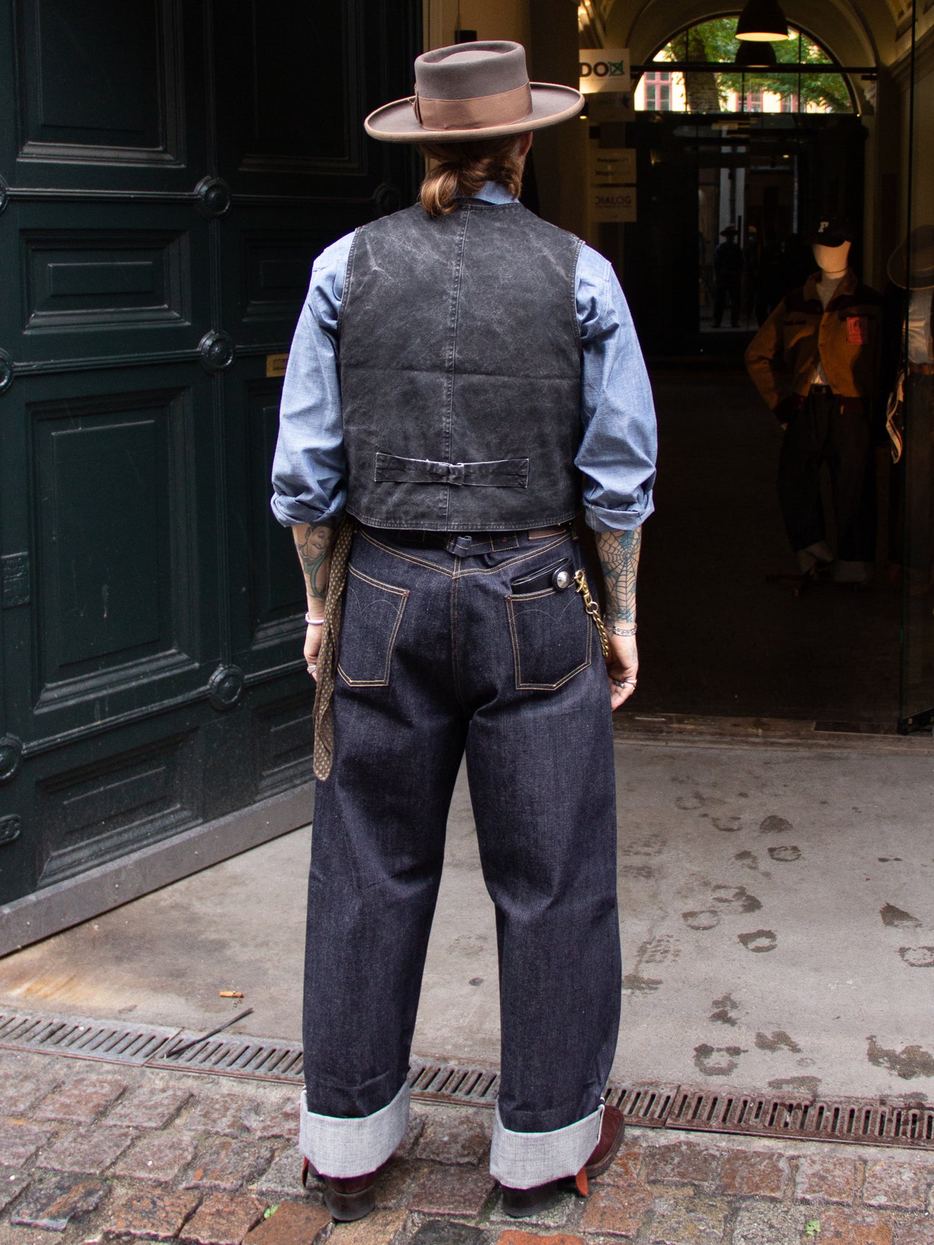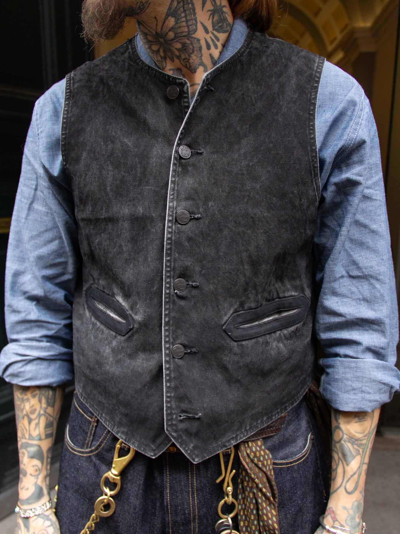 Vintage style waistcoat crafted from sumi dyed cotton canvas fabric with leather pocket reinforcements