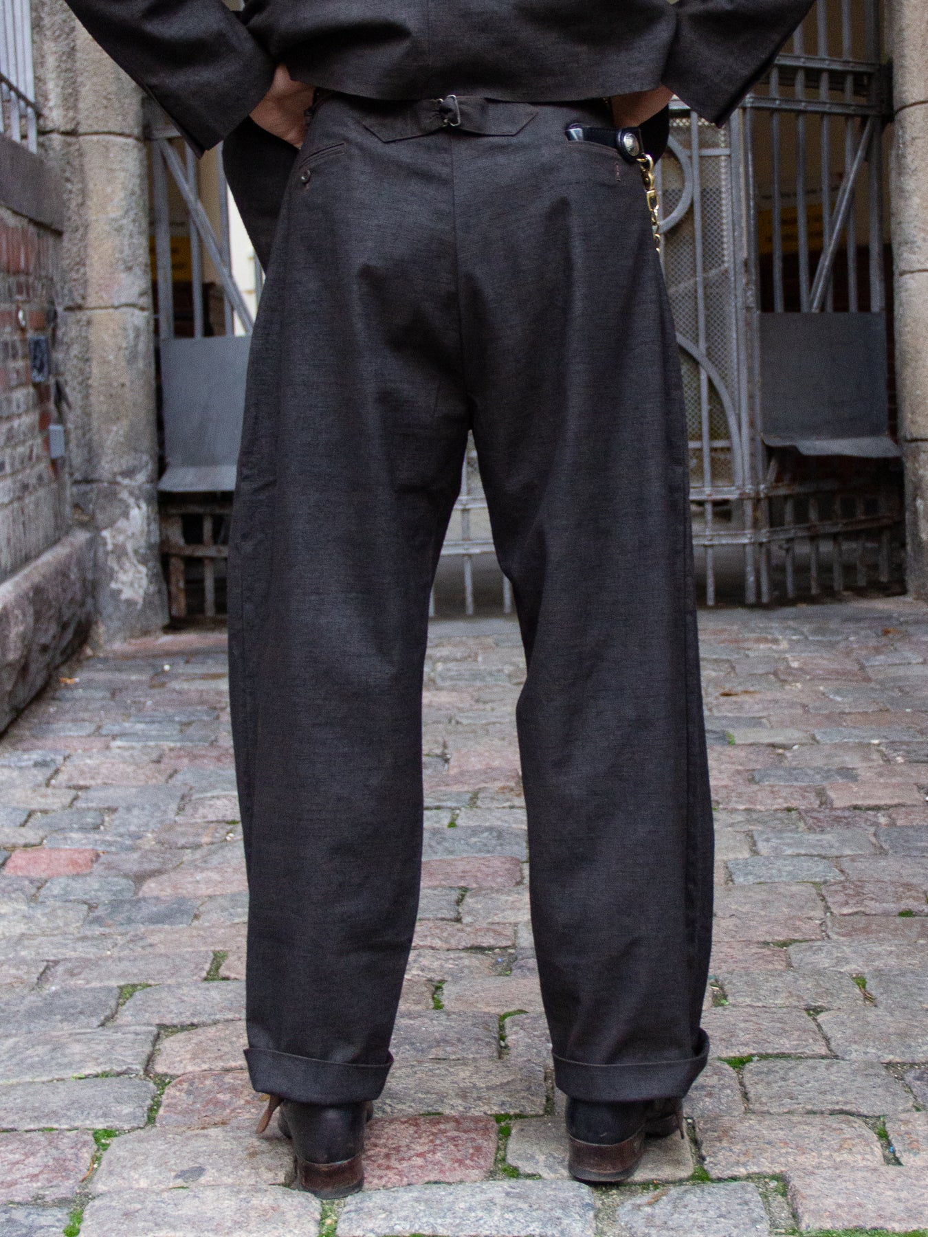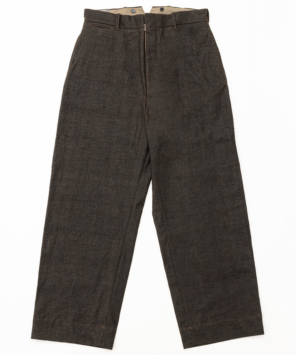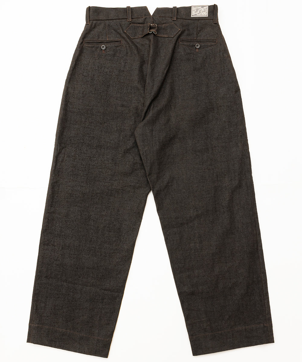 High-waisted, vintage-inspired trousers featuring a buckle-back / cinch-back detail. Crafted from a newly developed Doromole mud-dyed slub yarn canvas in 100% cotton, these trousers offer a dry hand feel and a timeless workwear character.