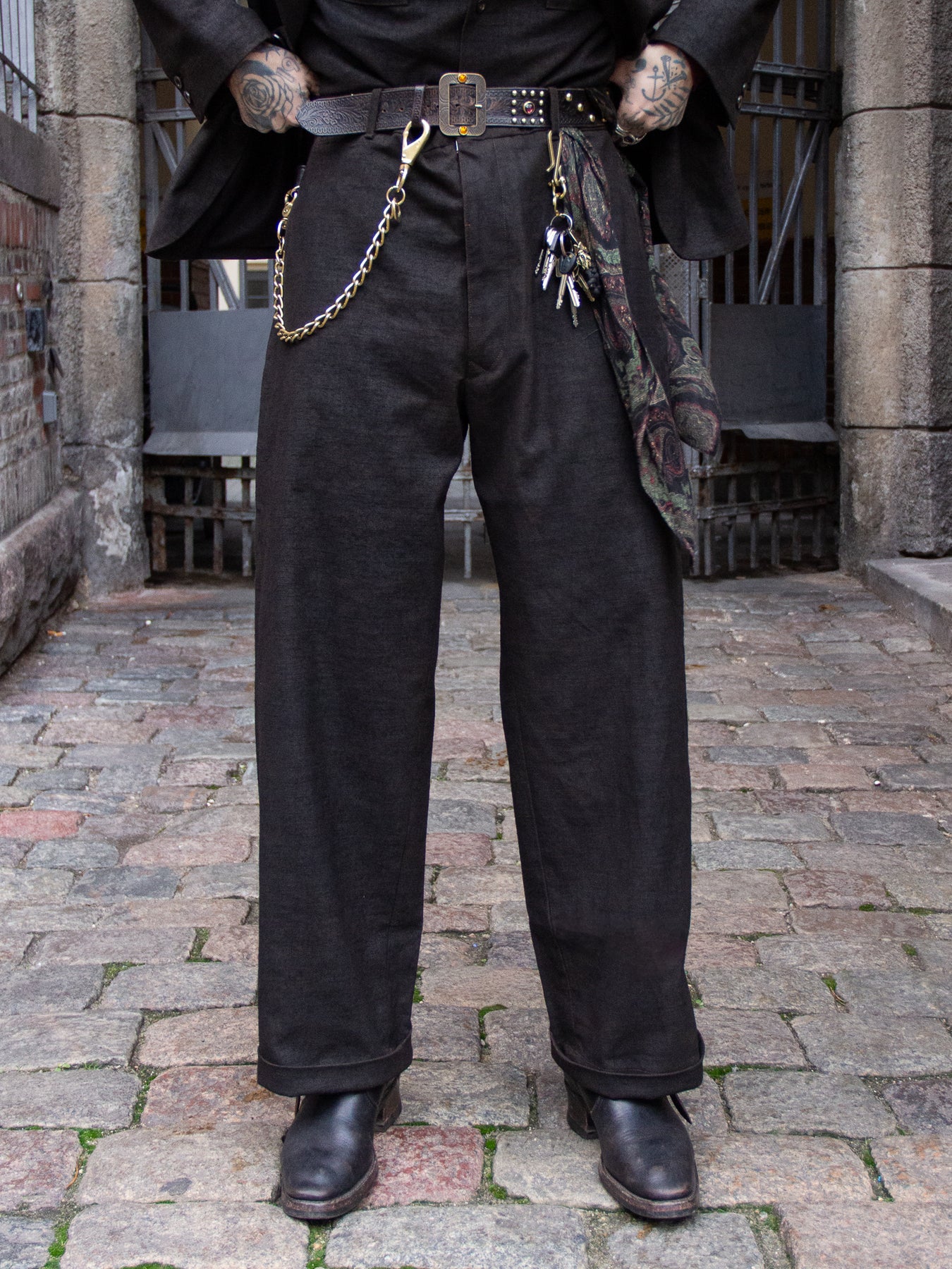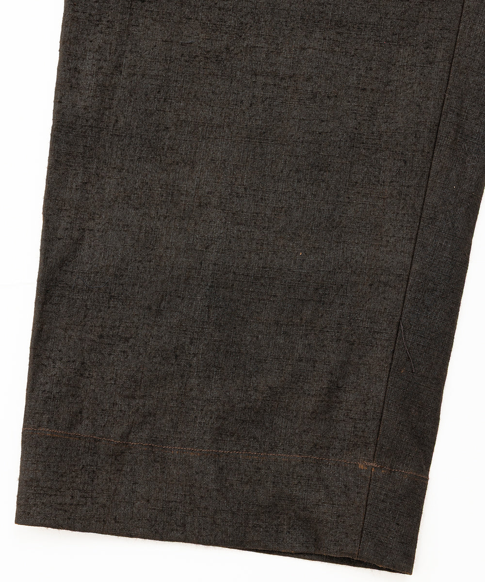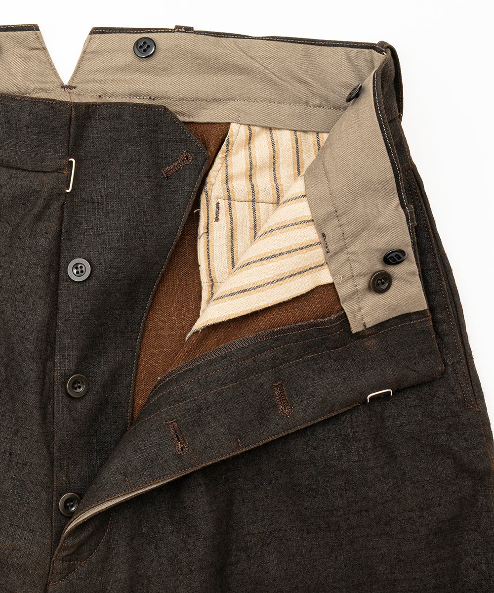 High-waisted, vintage-inspired trousers featuring a buckle-back / cinch-back detail. Crafted from a newly developed Doromole mud-dyed slub yarn canvas in 100% cotton, these trousers offer a dry hand feel and a timeless workwear character.