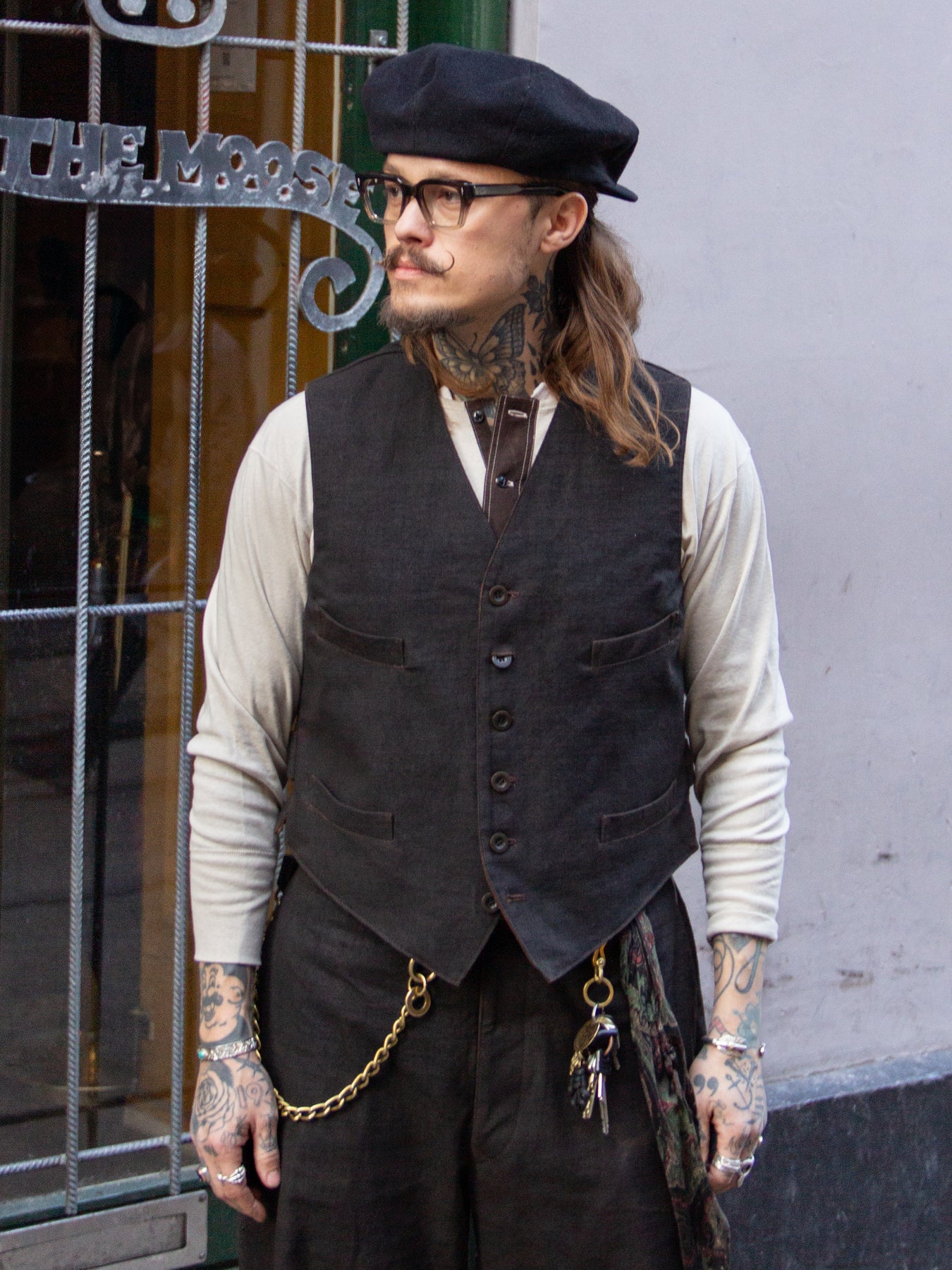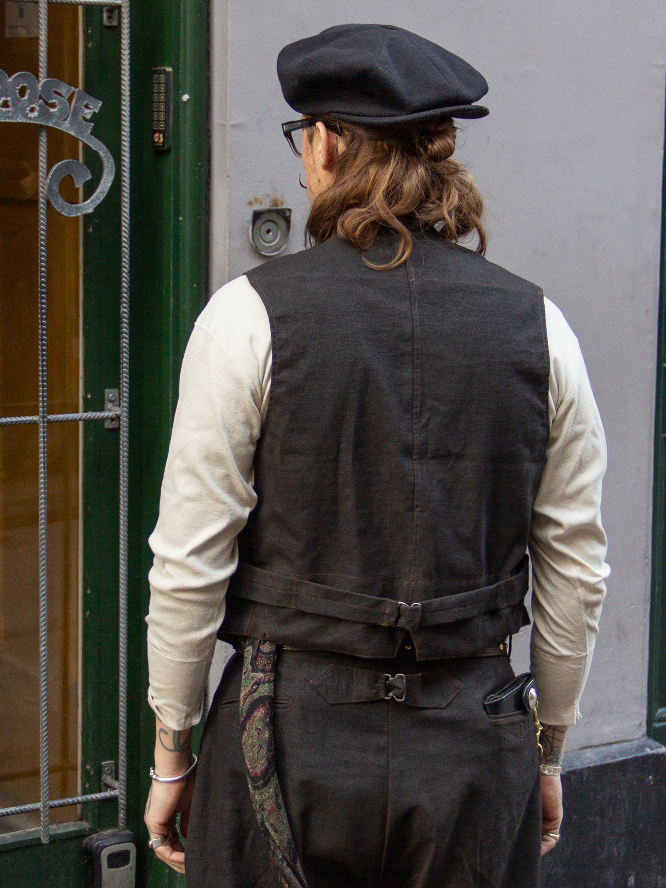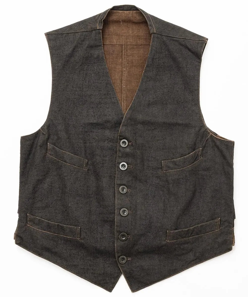 A 1930s-inspired waistcoat crafted from new slub yarn cotton canvas, mud-dyed in Belafonte’s signature Doromole process. The vest is slightly cropped, designed to pair perfectly with high-waisted trousers.